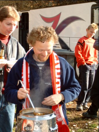 Jedenfalls haben wir den richter so zusammengebruellt, das er sich in irgendeiner ecke am poden waelzte waehrend ein elfer von unserem lieblinxtuerker einschlug nachdem unsere lieblingslatze addi assozial im strafraum gefoult wurde. Das war multikulti, das war das 2-2 und jetzt wollten wir alle mehr un haetten beinah gar nix behalten. Fidel fing mit picco an zu schaekern, doch er konnte ihn nicht ueberreden mit uff’s dixie zu kommen. Nach standards (ecken oder freistoese ganz egal) segelten die baelle durch unseren strafraum, das es nur so lachte: zwei dreimal vergaben die elversberger hier den sieg. Auf der anderen seite draengten unsere auch, so das im lokalen SR3 radiosender ein spieler der 07er nach getaner arbeit roechelte: „wir koennen froh ueber den punktgewinn sein, der elfer war berechtigt“ waehrend der kommentator ein riesenpiel beschrieb.