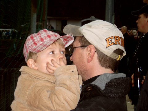 ja was soll ich sagen, ich stand den traenen des glueckes nah, nachdem er wacker allein den platz stuermen wollte, verspuerte er nun instinktiv den drang den gegnerischen block umzupfluegen un denen die trommel abzunehmen. Wir also rums raus die straße hochgerannt, richtung trommel. Angekommen mussten wir feststellen das sich niemand gerade machen wollte.... ja gibt’s den so was??? niemand traute sich unseren newpicco auch nur schief anzuguggen. Im gegenteil, er stand kurz davor ein gummibaerschen zu erbeuten. Voellisch entnervt beschlossen wir wieder stellung in den eigene reihen einzunehmen, da gibt’s wenixtens gewaltbereite paedophile stricher, die zu ihren neigungen stehen un nicht gleich vornem kiddi nen rueckzieher machen.